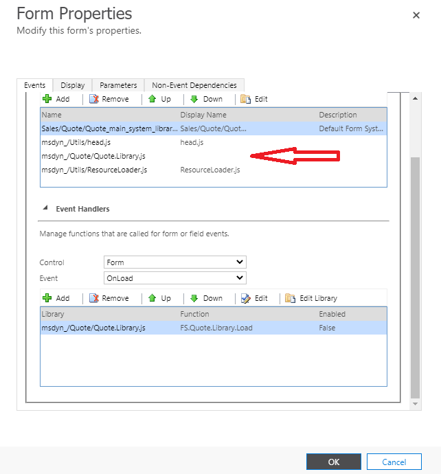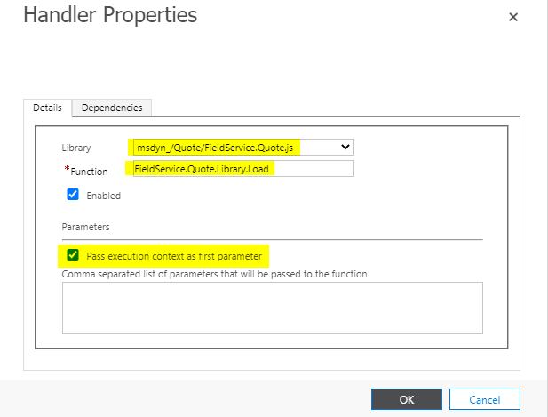 - Add the event handler with the new Form OnLoad method (e.g. FieldService.Quote.Library.Load) and make sure that Pass execution context as first parameter is checked.​