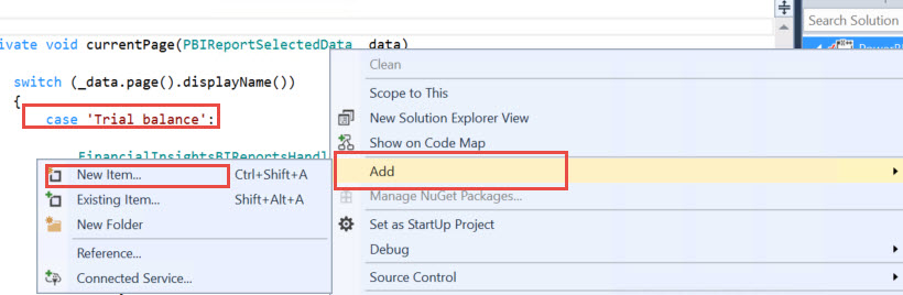 2. Open Visual Studio in your dev box and Right click on your project - Add - New Item