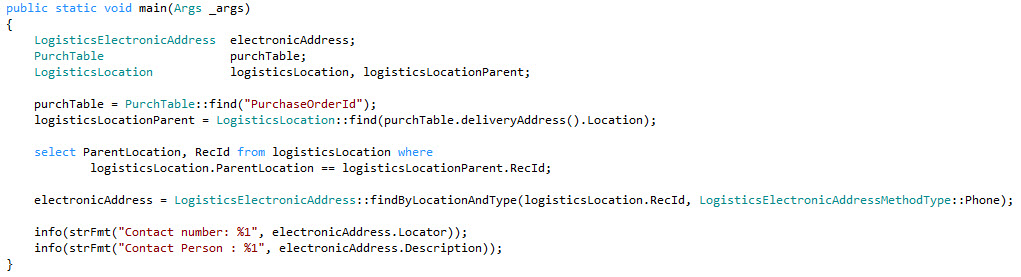 | public static void main(Args _args) { LogisticsElectronicAddress electronicAddress; PurchTable purchTable; LogisticsLocation logisticsLocation, logisticsLocationParent; purchTable = PurchTable::find("PurchaseOrderId"); logisticsLocationParent = LogisticsLocation::find(purchTable.deliveryAddress().Location); select ParentLocation, RecId from logisticsLocation where logisticsLocation.ParentLocation == logisticsLocationParent.RecId; electronicAddress = LogisticsElectronicAddress::findByLocationAndType(logisticsLocation.RecId, LogisticsElectronicAddressMethodType::Phone); info(strFmt("Contact number: %1", electronicAddress.Locator)); info(strFmt("Contact Person : %1", electronicAddress.Description)); } |
