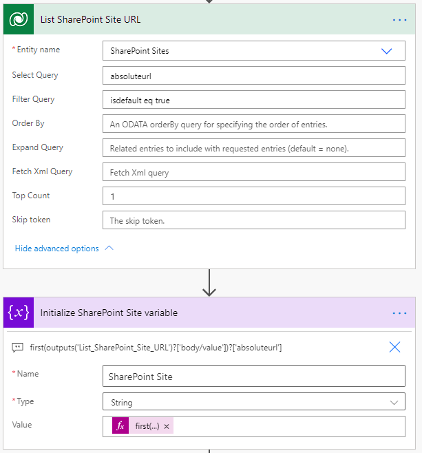 You might notice that the server relative URL starts with the custom site collection URL "/sites/documents" from the SharePoint Site variable. In order to split the custom site collection URL from SharePoint Site variable, uriPath() function is used as follows: