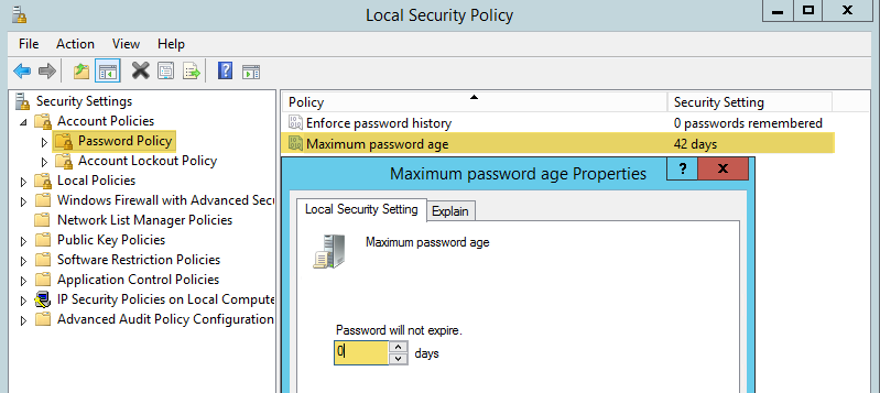 From there it is just a matter of changing the expiration of the password to something other than 42, or simply set it to 0 for "never expire".