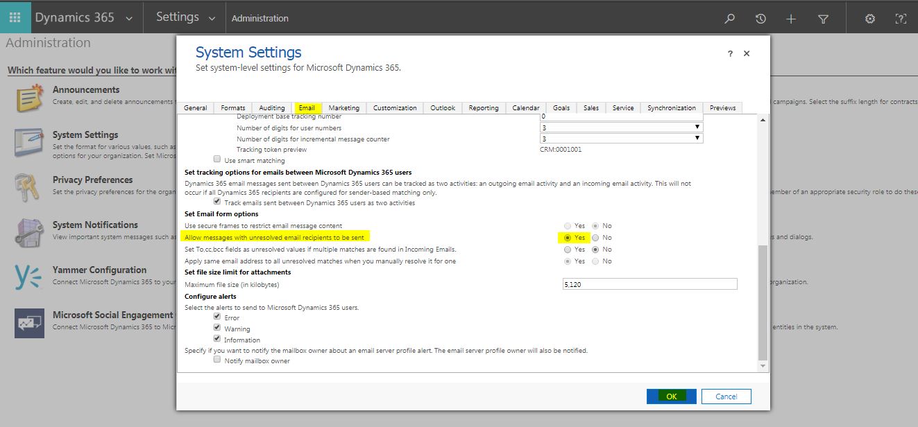 CRM System Setting: Allow messages with unresolved email recipients to be sent